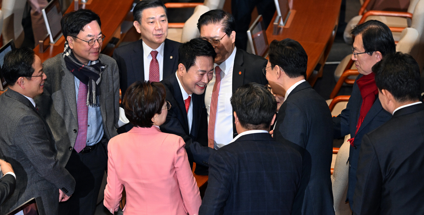 장동혁 국민의힘 대표(가운데)가 4일 국회에서 열린 본회의에서 교섭단체 대표연설을 마친 뒤 동료 의원들과 인사를 나누고 있다. /송의주 기자